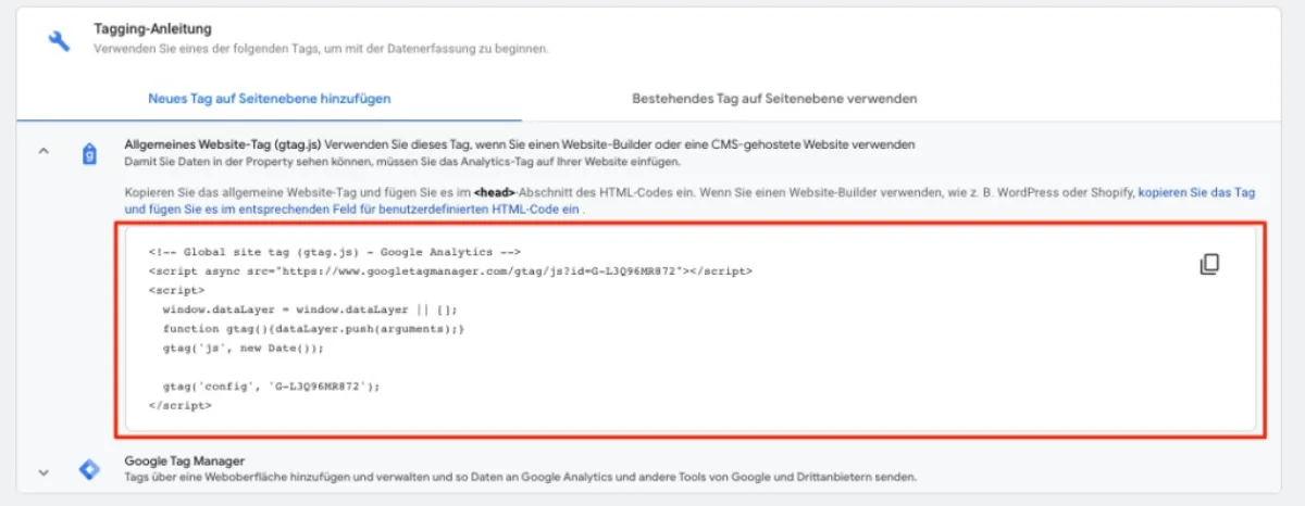 Wie beim bisherigen UA haben Sie auch bei GA4 zwei Möglichkeiten, das Tracking Tag in die Webseite einzubinden.