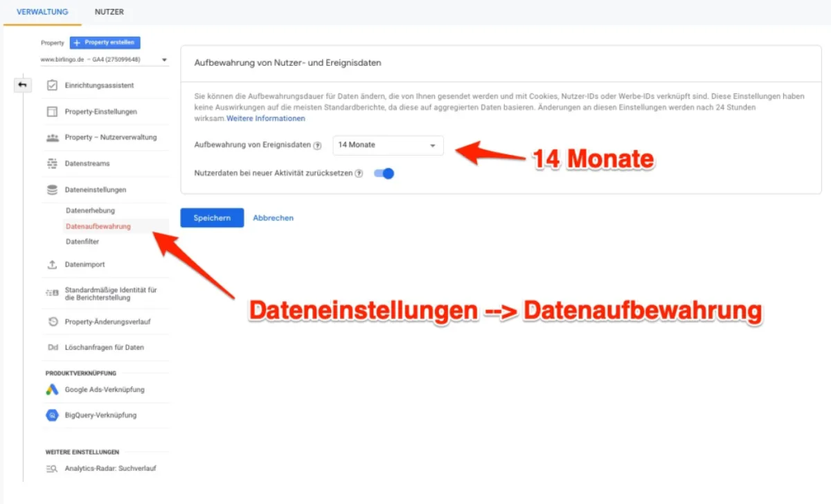 Abbildung 13 GA4 Datenaufbewahrungseinstellungen