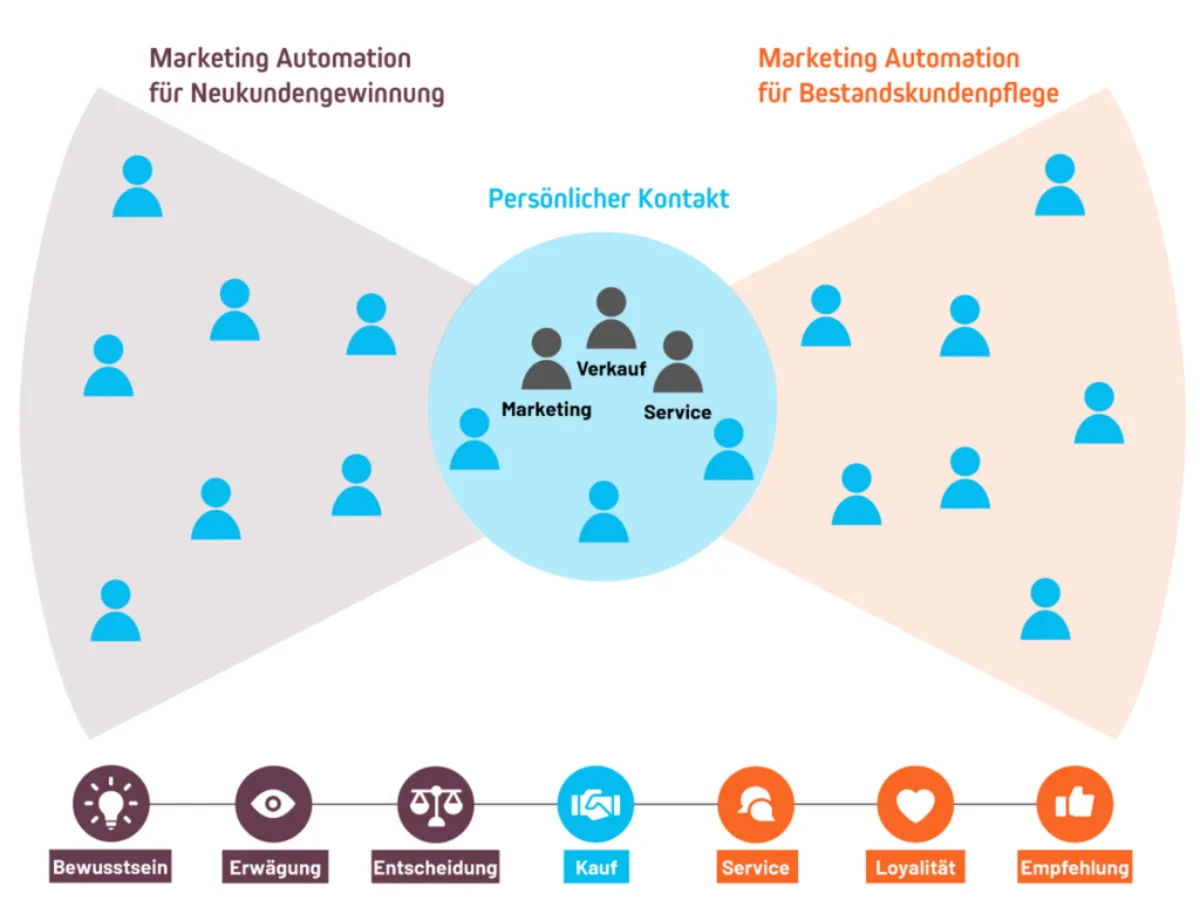 Es ist klar, den Kontakt von Mensch zu Mensch kann keine Maschine ersetzen. Insbesondere im B2B-Bereich geschieht der Abschluss in der Regel über den direkten Kontakt. Die Marketing Automation ist jedoch ein mächtiges Werkzeug, um diese Kontakte vorzubereiten. Potenzielle Kunden (Leads) werden frühzeitig erkannt und können auf ihrer Kundenreise (Customer Journey) begleitet werden. Unternehmen erweitern so die Reichweite enorm. Im Bestandskundengeschäft kann die Marketing Automatisierung ebenfalls eingesetzt werden. Bisher unbearbeitetes Potenzial in Marketing, Sales und Service wird besser ausgeschöpft und Ressourcen für andere Aufgaben werden frei.